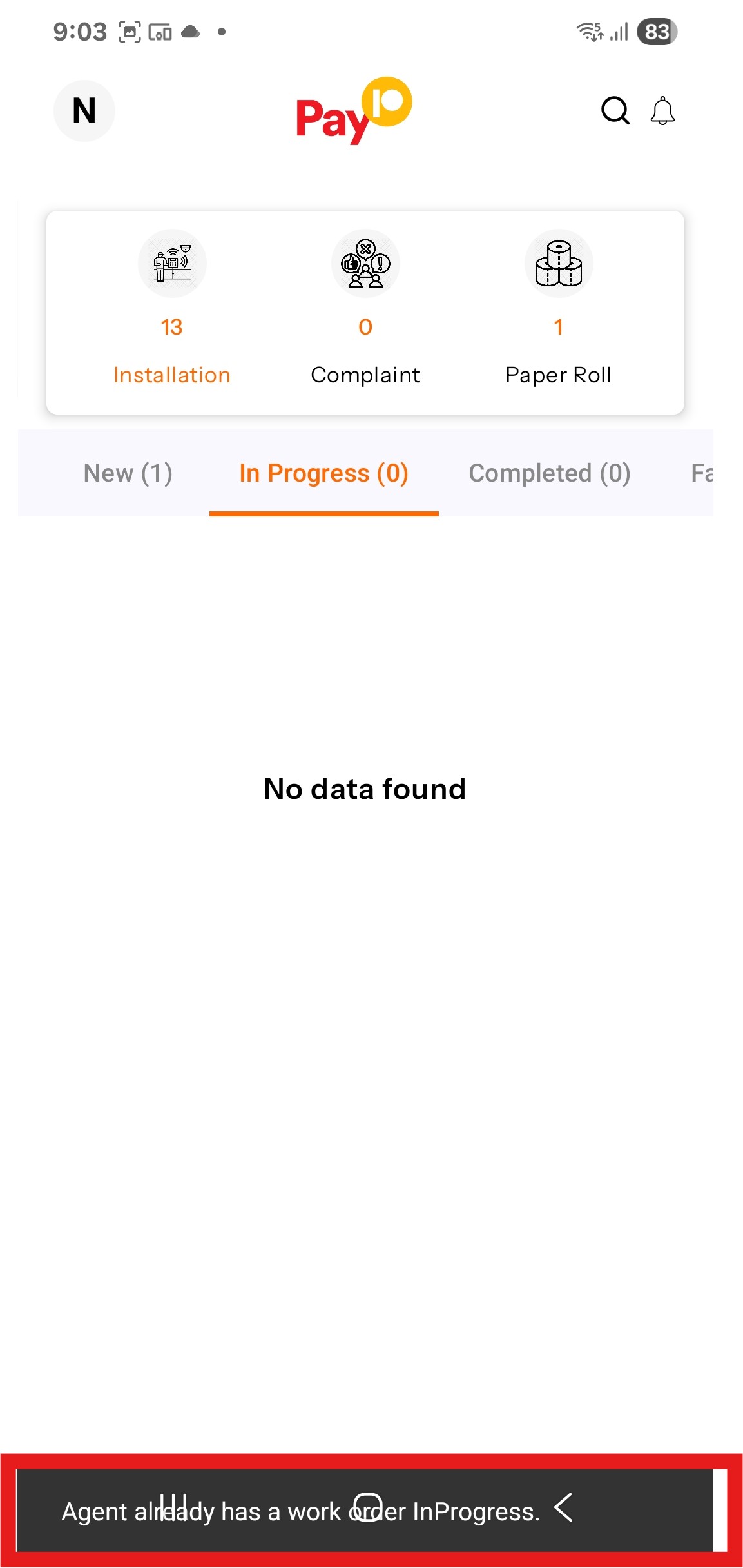 In the FMS App, while selecting Job Start, the system displays an error stating that the agent work is already in process (as shown in the attached image – App Error 1).