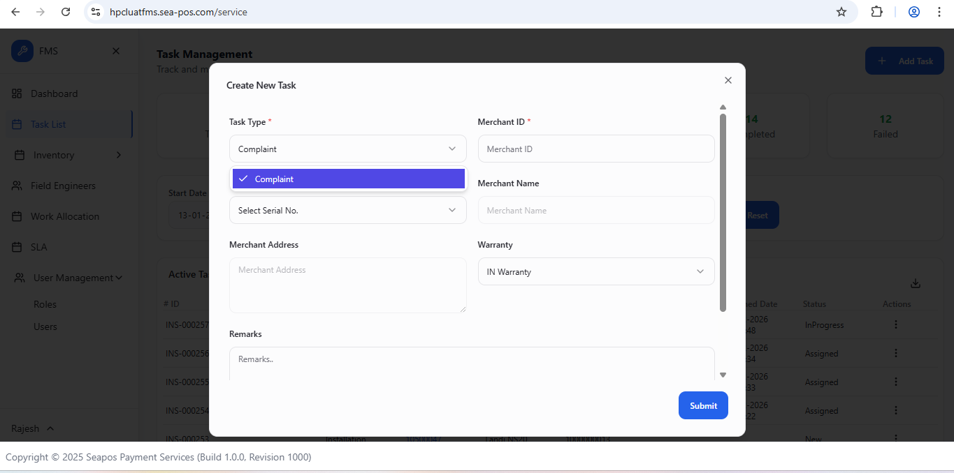 Bug Title: Remove Paper Roll Delivery task type from drop-down list(On FMS web)