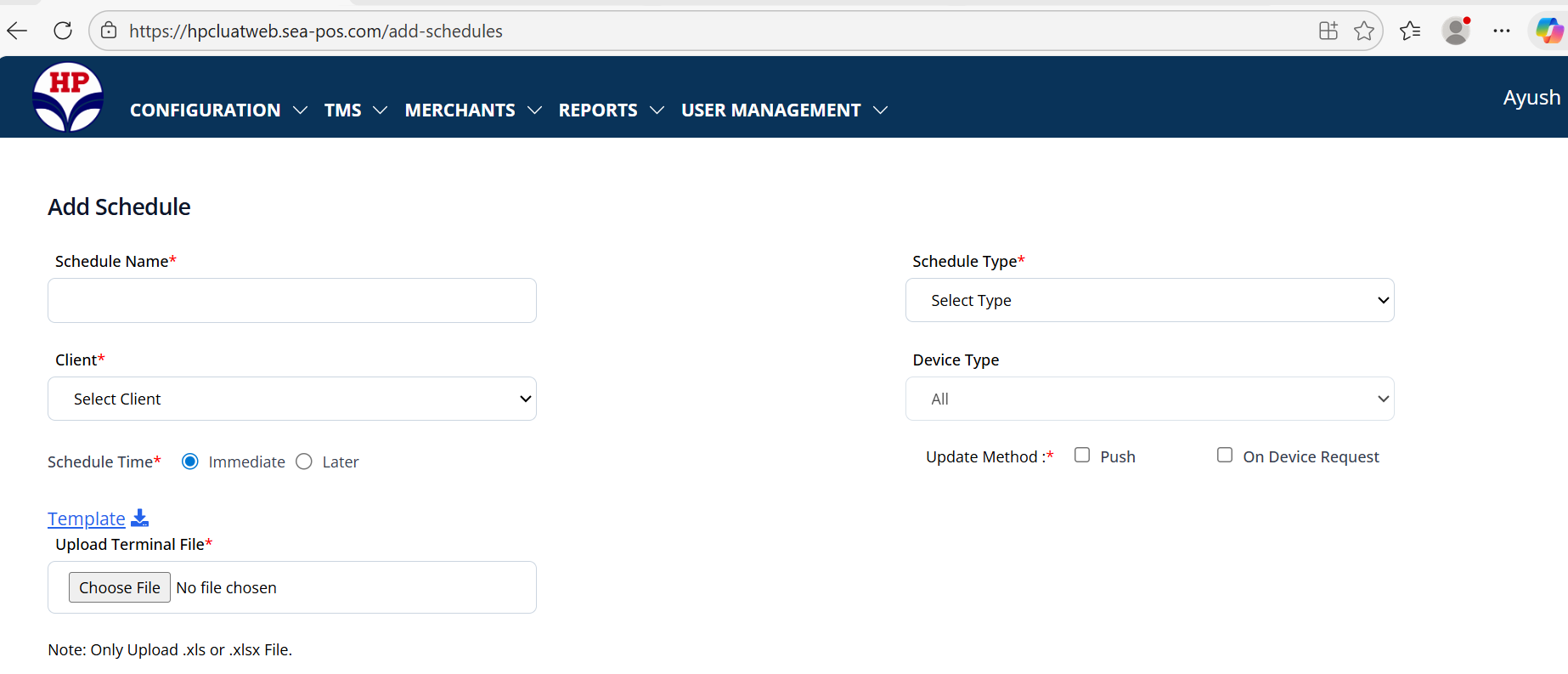 In the upload terminal file field, the supported file formats are not mentioned in the file name or upload label. Users are not informed about which file formats are allowed before uploading an application file.