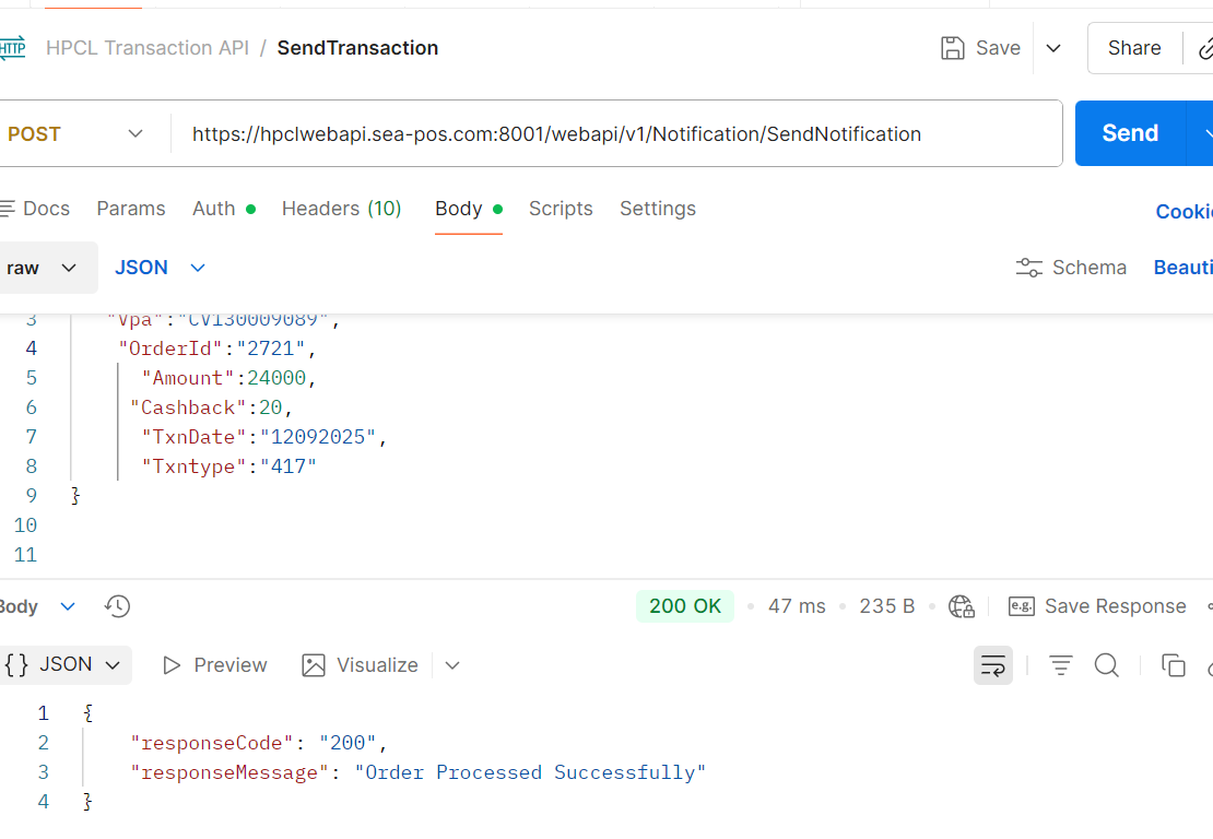 Sent transaction from API